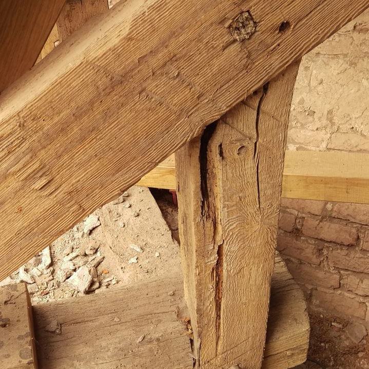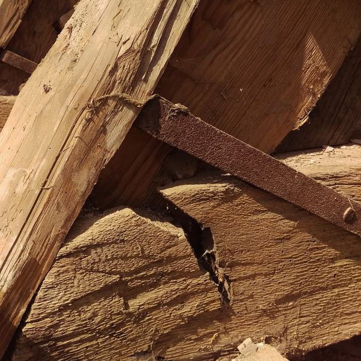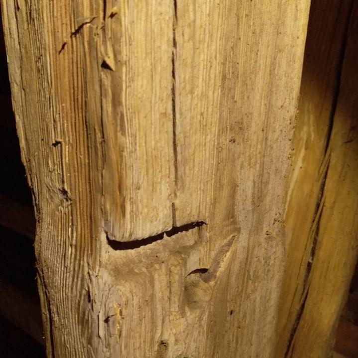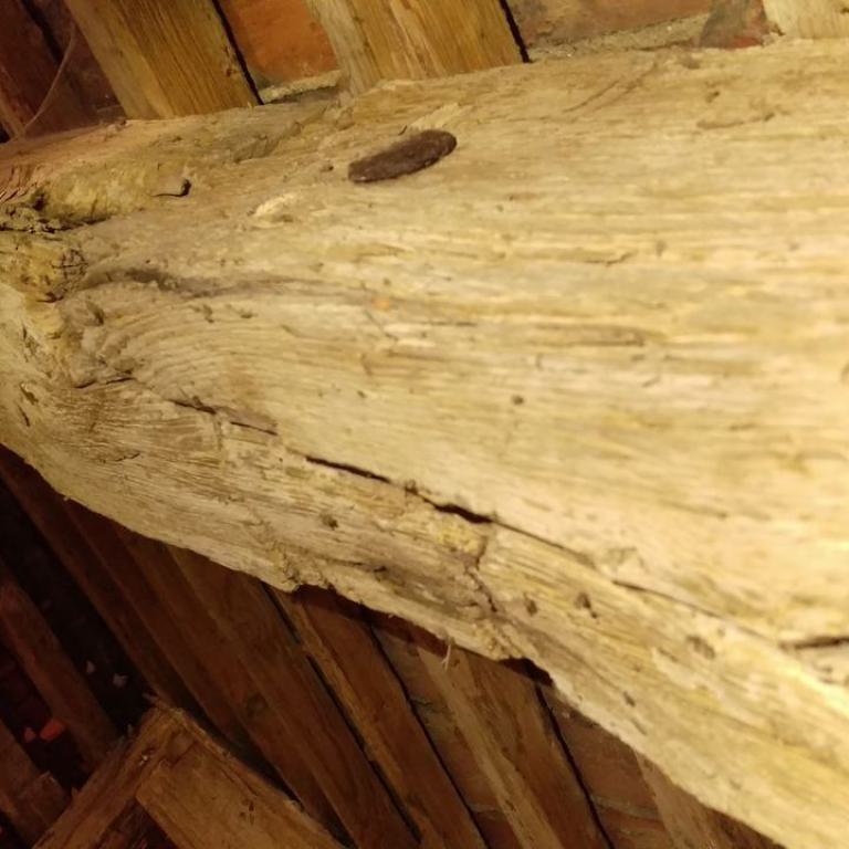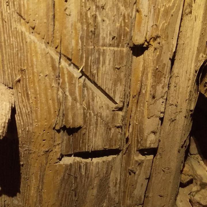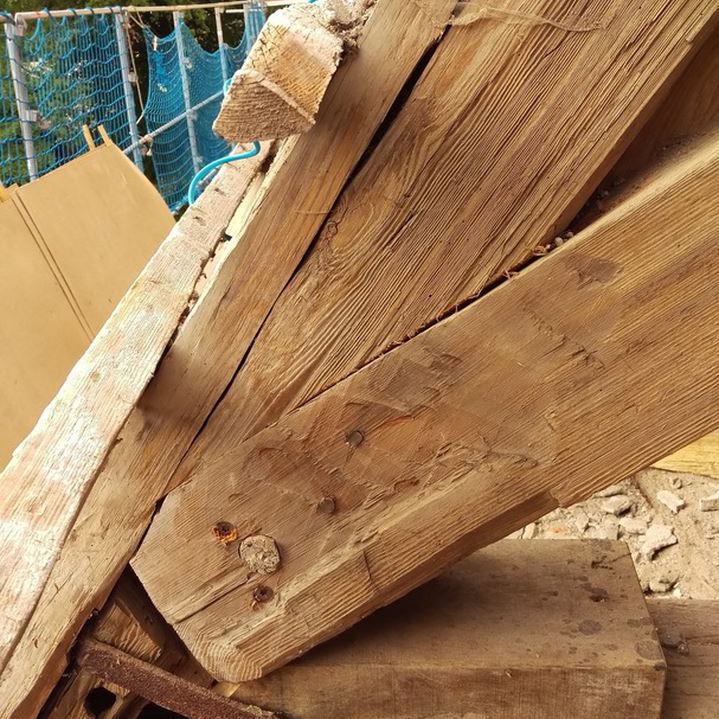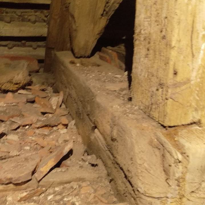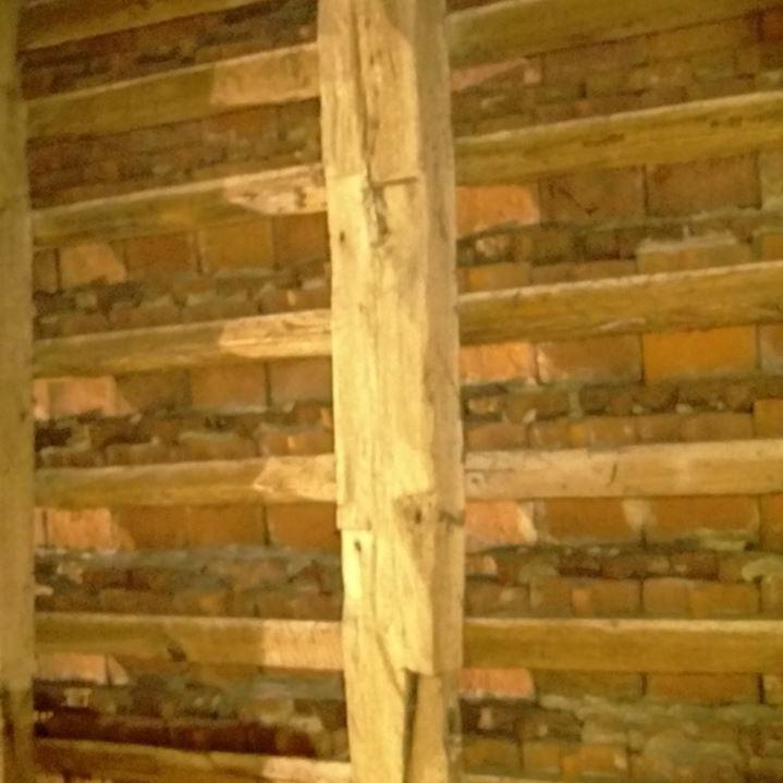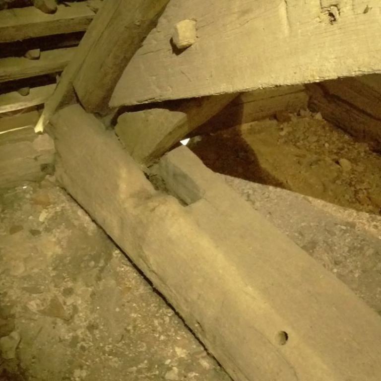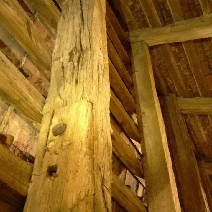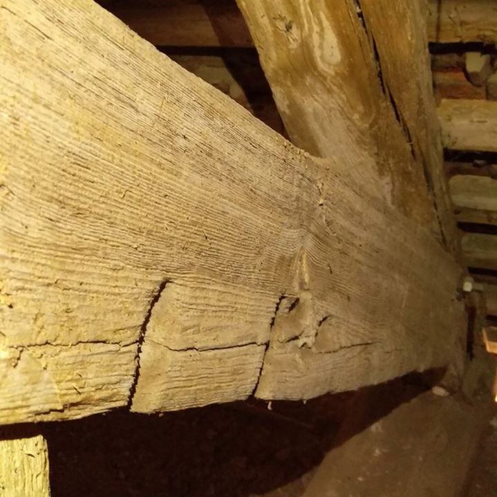 Inzwischen hatte Tilo Schölfbeck (der Bauforscher) einige Dendroproben genommen, welche meine Vermutungen bestätigten. Demnach besteht der Dachstuhl zwischen Chor und Turm aus zwei Dächern, die im Abstand von etwa 13 Jahren abgezimmert und aufgestellt wurden, wobei das Jüngere (datiert auf 1303) komplett aus aufgesägten, zum Teil geviertelten (Ursprüngliche Holzstärke 35cm x 35cm-möglicherweise Keiserstiehl ?) mächtigen eichenen Wiederverwendungen (datiert auf 1233 - Vorgängerbau ?) besteht und teilweise Lattenabgratungen aufweist, die auf ein polygones Dach oder polygonen Ständerbau hinweist der auf Grund der sich abwechselnden Lattenabstände von 43cm und 53cm auf eine gemusterte Holzverschindelung-oder Schalung hindeutet :-). Nur die Streben sind aus Eschen-Schwarten ! und ermöglichten die Datierung dieses Daches.