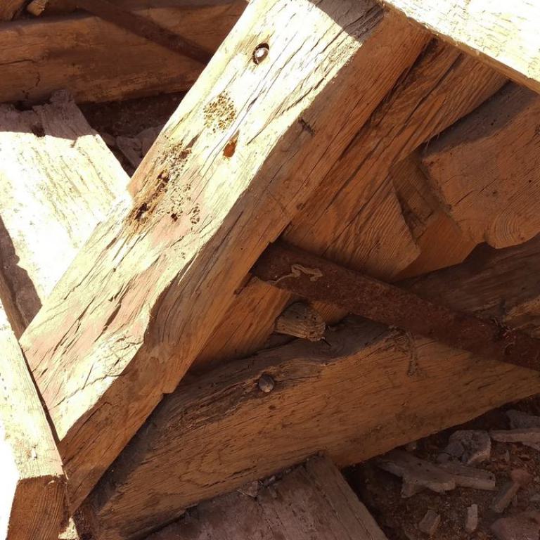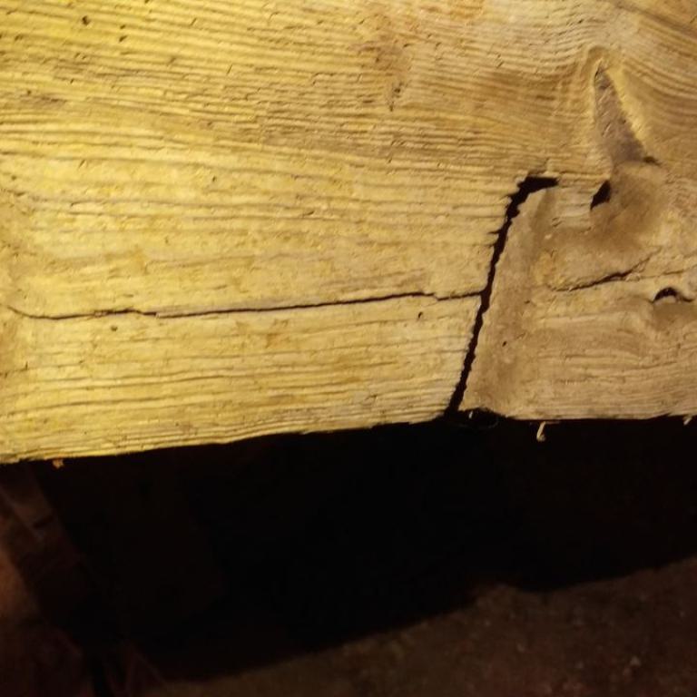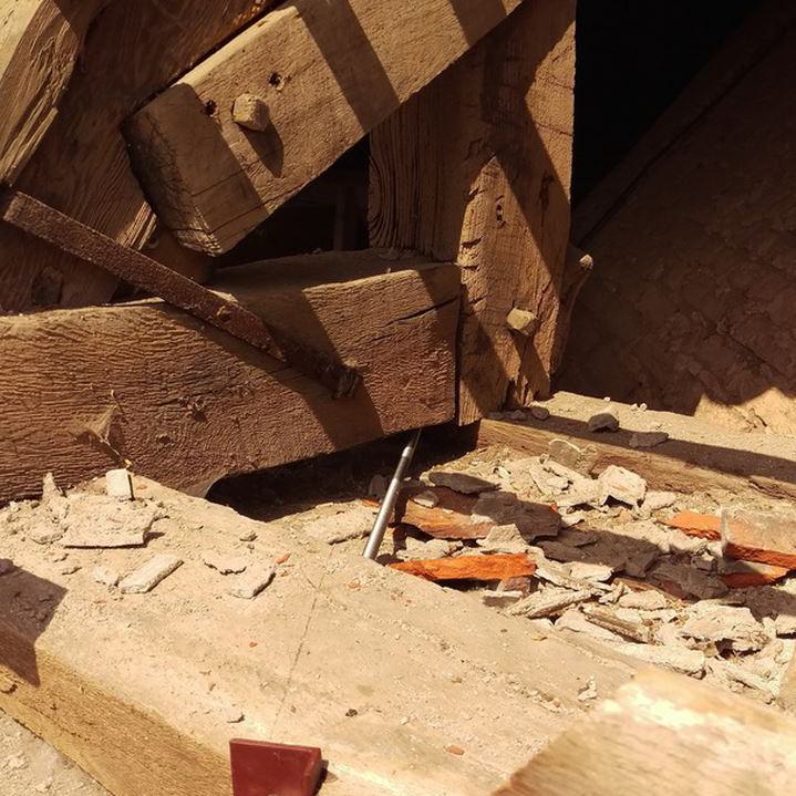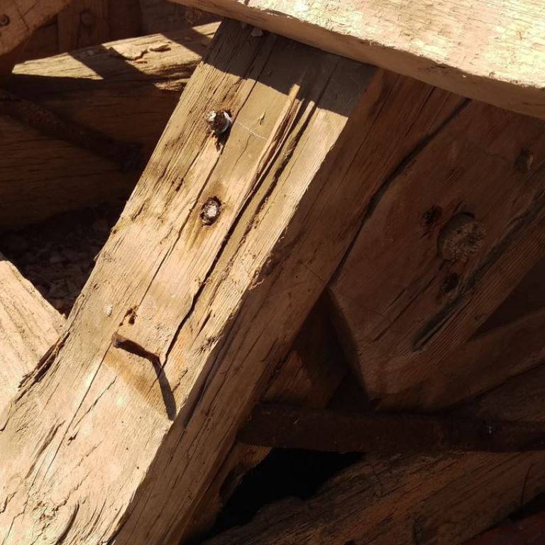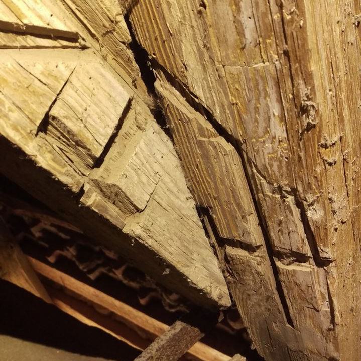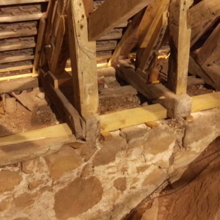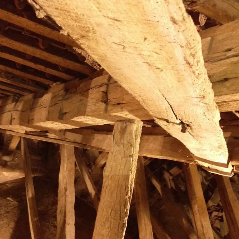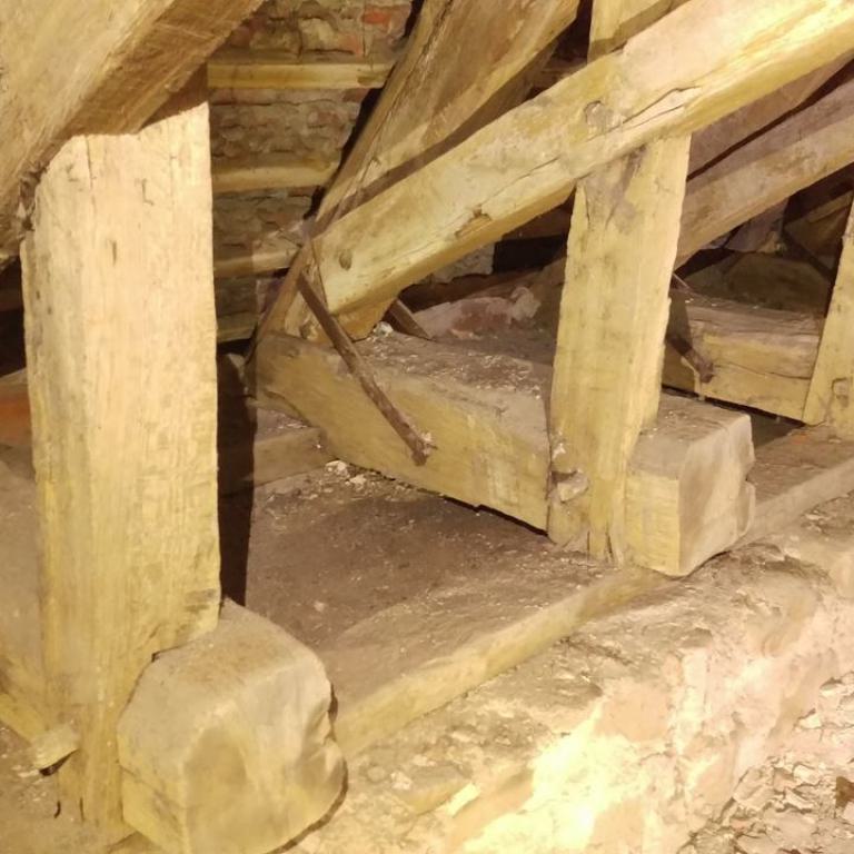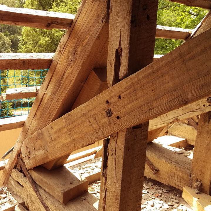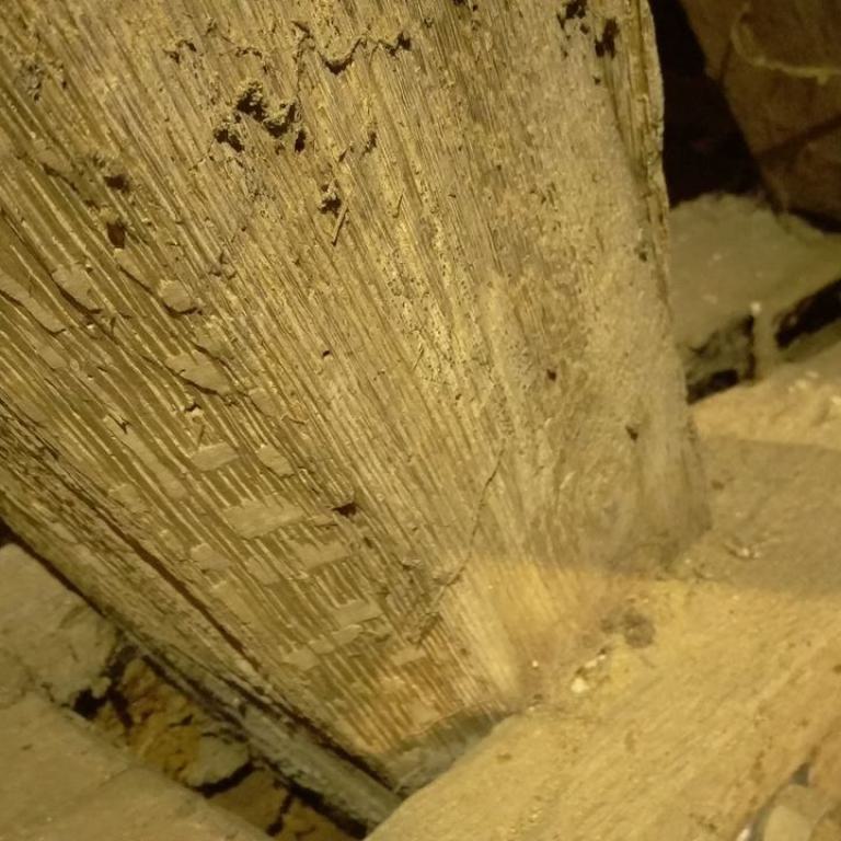 Inzwischen hatte Tilo Schölfbeck (der Bauforscher) einige Dendroproben genommen, welche meine Vermutungen bestätigten. Demnach besteht der Dachstuhl zwischen Chor und Turm aus zwei Dächern, die im Abstand von etwa 13 Jahren abgezimmert und aufgestellt wurden, wobei das Jüngere (datiert auf 1303) komplett aus aufgesägten, zum Teil geviertelten (Ursprüngliche Holzstärke 35cm x 35cm-möglicherweise Keiserstiehl ?) mächtigen eichenen Wiederverwendungen (datiert auf 1233 - Vorgängerbau ?) besteht und teilweise Lattenabgratungen aufweist, die auf ein polygones Dach oder polygonen Ständerbau hinweist der auf Grund der sich abwechselnden Lattenabstände von 43cm und 53cm auf eine gemusterte Holzverschindelung-oder Schalung hindeutet :-). Nur die Streben sind aus Eschen-Schwarten ! und ermöglichten die Datierung dieses Daches.