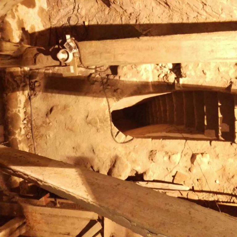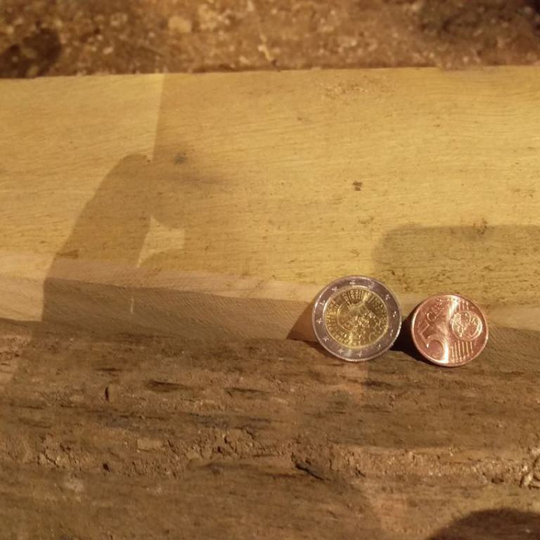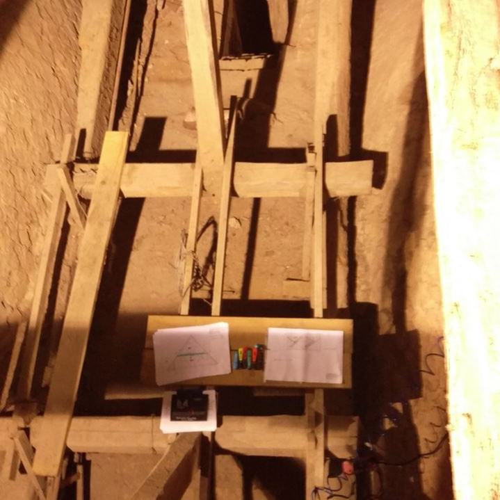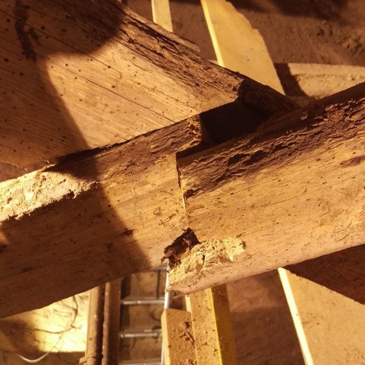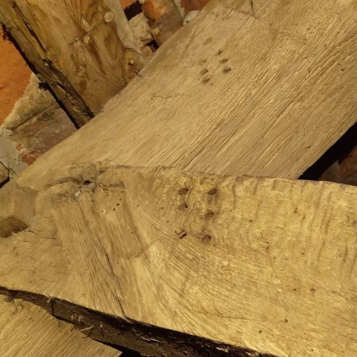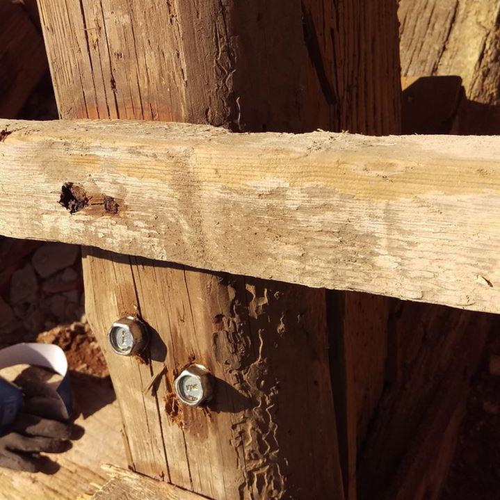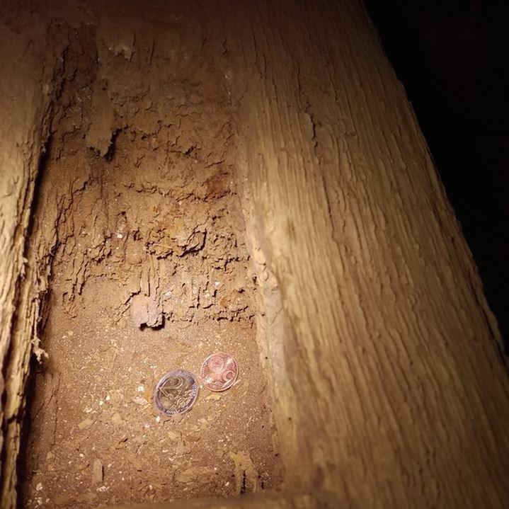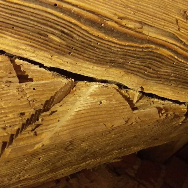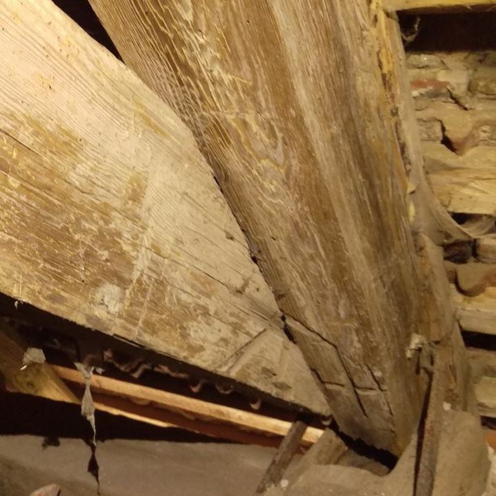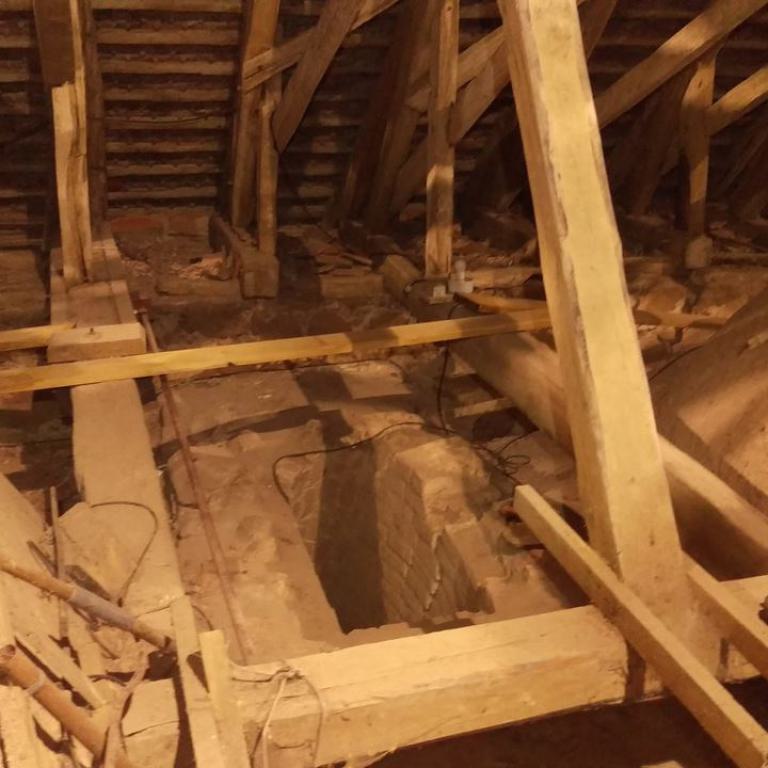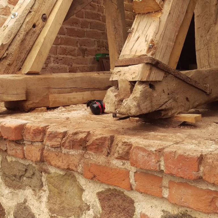 Inzwischen hatte Tilo Schölfbeck (der Bauforscher) einige Dendroproben genommen, welche meine Vermutungen bestätigten. Demnach besteht der Dachstuhl zwischen Chor und Turm aus zwei Dächern, die im Abstand von etwa 13 Jahren abgezimmert und aufgestellt wurden, wobei das Jüngere (datiert auf 1303) komplett aus aufgesägten, zum Teil geviertelten (Ursprüngliche Holzstärke 35cm x 35cm-möglicherweise Keiserstiehl ?) mächtigen eichenen Wiederverwendungen (datiert auf 1233 - Vorgängerbau ?) besteht und teilweise Lattenabgratungen aufweist, die auf ein polygones Dach oder polygonen Ständerbau hinweist der auf Grund der sich abwechselnden Lattenabstände von 43cm und 53cm auf eine gemusterte Holzverschindelung-oder Schalung hindeutet :-). Nur die Streben sind aus Eschen-Schwarten ! und ermöglichten die Datierung dieses Daches.